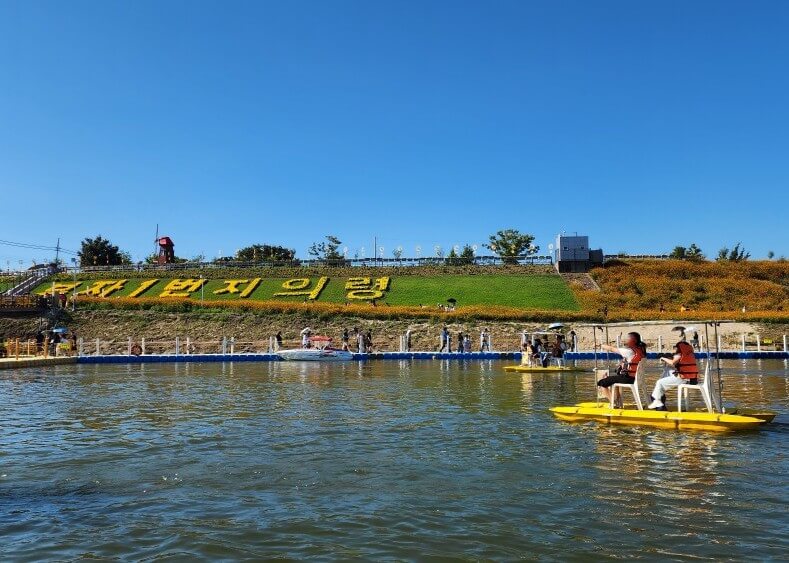 의령 리치리치 페스티벌을 구경하러 갔던 날, 날씨가 정말 장난 아니었습니다. 하늘은 맑았지만 햇빛이 얼마나 강하던지 우산을 써야 할 정도로 뜨겁고, 온도는 무려 32도까지 올랐습니다. 그야말로 여름의 끝자락을 제대로 느낄 수 있었죠. 그래도 축제 분위기는 최고였어요. 의령 강가에는 배를 타는 사람들도 있었고, 곳곳에서 음악이 흘러나오며 사람들로 북적였어요. 사진도 찍고, 먹거리도 구경하고, 정말 “축제에 왔구나” 싶을 정도로 활기찼습니다.